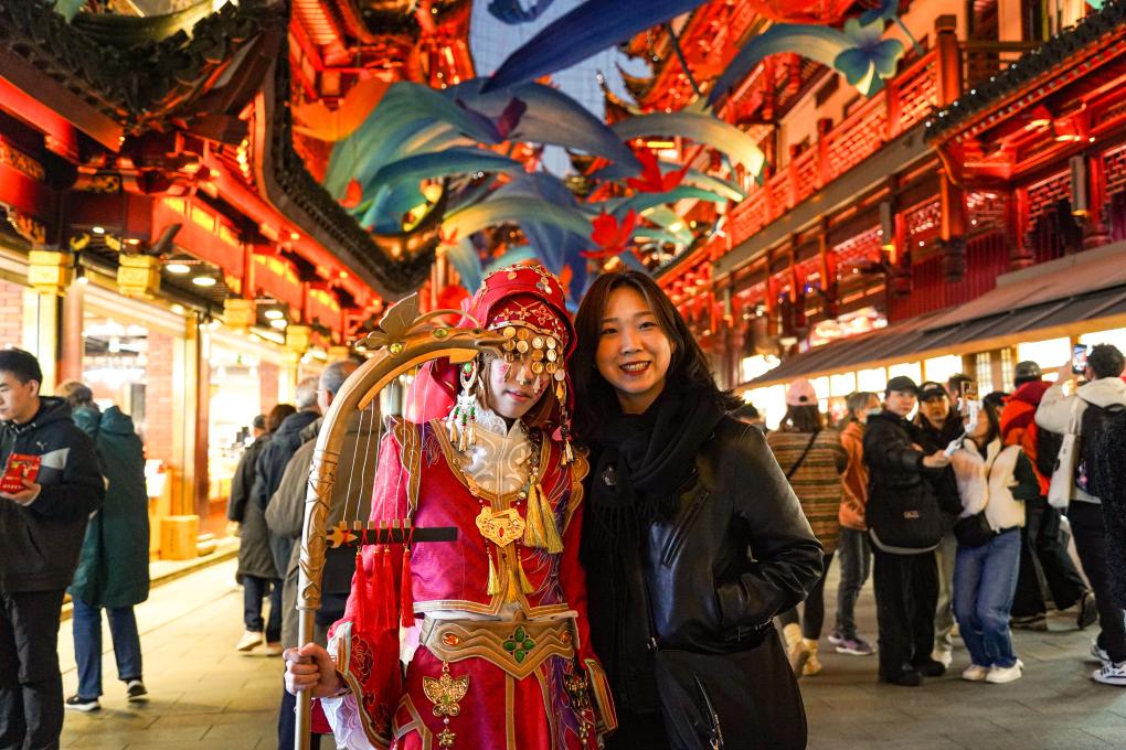 2024年11月30日,來自韓國的游客(右)在上海豫園商城與游戲角色裝扮者合影。新華社發(fā)(謝鑫攝)