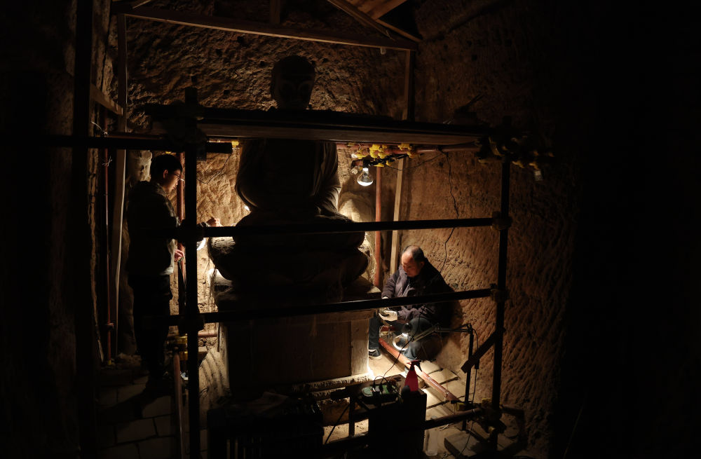 2024年11月2日,麥積山石窟藝術(shù)研究所保護(hù)研究室的高級(jí)文物修復(fù)師牟常有(右)和徒弟何舉在麥積山石窟133窟內(nèi)修復(fù)塑像。自1985年至今,牟常有在麥積山石窟藝術(shù)研究所工作已有四十年。經(jīng)過(guò)多年磨礪,牟常有的文物修復(fù)技藝日臻成熟,面對(duì)年輕人的請(qǐng)教,他更是傾囊相授?!八芟癖诋?huà)皆是凝固的歷史,守護(hù)它們,需要耐心和毅力,相信年輕人能夠接好接力棒,讓這份珍貴的人類文化遺產(chǎn)永續(xù)?!蹦渤S姓f(shuō)。
