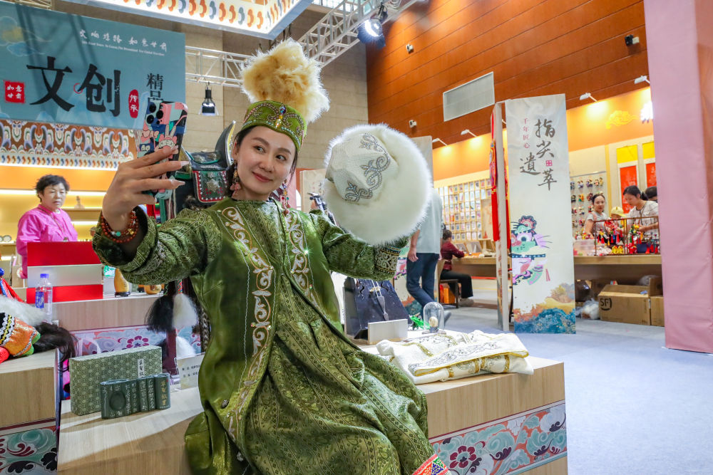 2025年9月22日,游客在敦煌文博會(huì)上身穿民族服飾自拍。9月20日至22日,第八屆絲綢之路(敦煌)國(guó)際文化博覽會(huì)在敦煌市舉行。敦煌研究院“典范”“高地”建設(shè)成果展、甘肅文旅非遺文創(chuàng)展、敦煌·絲路雕塑展等多項(xiàng)展覽同步亮相,集中展現(xiàn)了敦煌文化遺產(chǎn)保護(hù)、研究、弘揚(yáng)的最新成果以及共建“一帶一路”國(guó)家的文化藝術(shù)、非遺文創(chuàng)、風(fēng)土人情等精彩內(nèi)容。