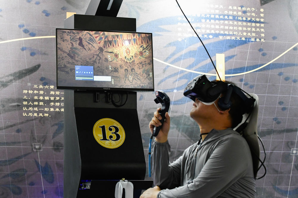 2024年7月22日,一名游客在敦煌莫高窟“尋境敦煌——數(shù)字敦煌沉浸展”上借助VR設(shè)備沉浸式游覽莫高窟第285窟虛擬場(chǎng)景?!皩ぞ扯鼗汀本C合運(yùn)用了VR虛擬現(xiàn)實(shí)、三維建模、游戲引擎的物理渲染和全局動(dòng)態(tài)光照等新技術(shù),高精度立體還原了莫高窟第285窟。游客戴上VR眼鏡,不僅可以零距離觀賞壁畫(huà)、360度自由探索洞窟細(xì)節(jié),還能“飛升”到窟頂,身臨其境參與壁畫(huà)故事情節(jié),沉浸式感受敦煌文化的魅力。
