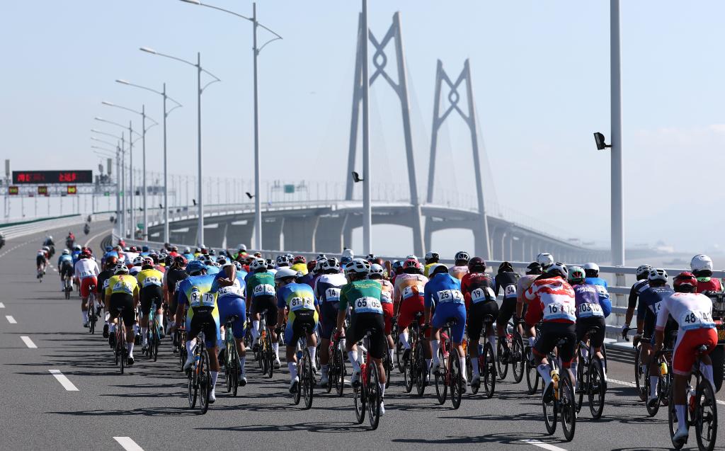 11月8日,參賽選手在港珠澳大橋騎行。當日進行的第十五屆全國運動會公路自行車男子個人賽,賽道全程231.8公里,選手經(jīng)過港珠澳大橋,跨越粵港澳三地。圖源:新華社