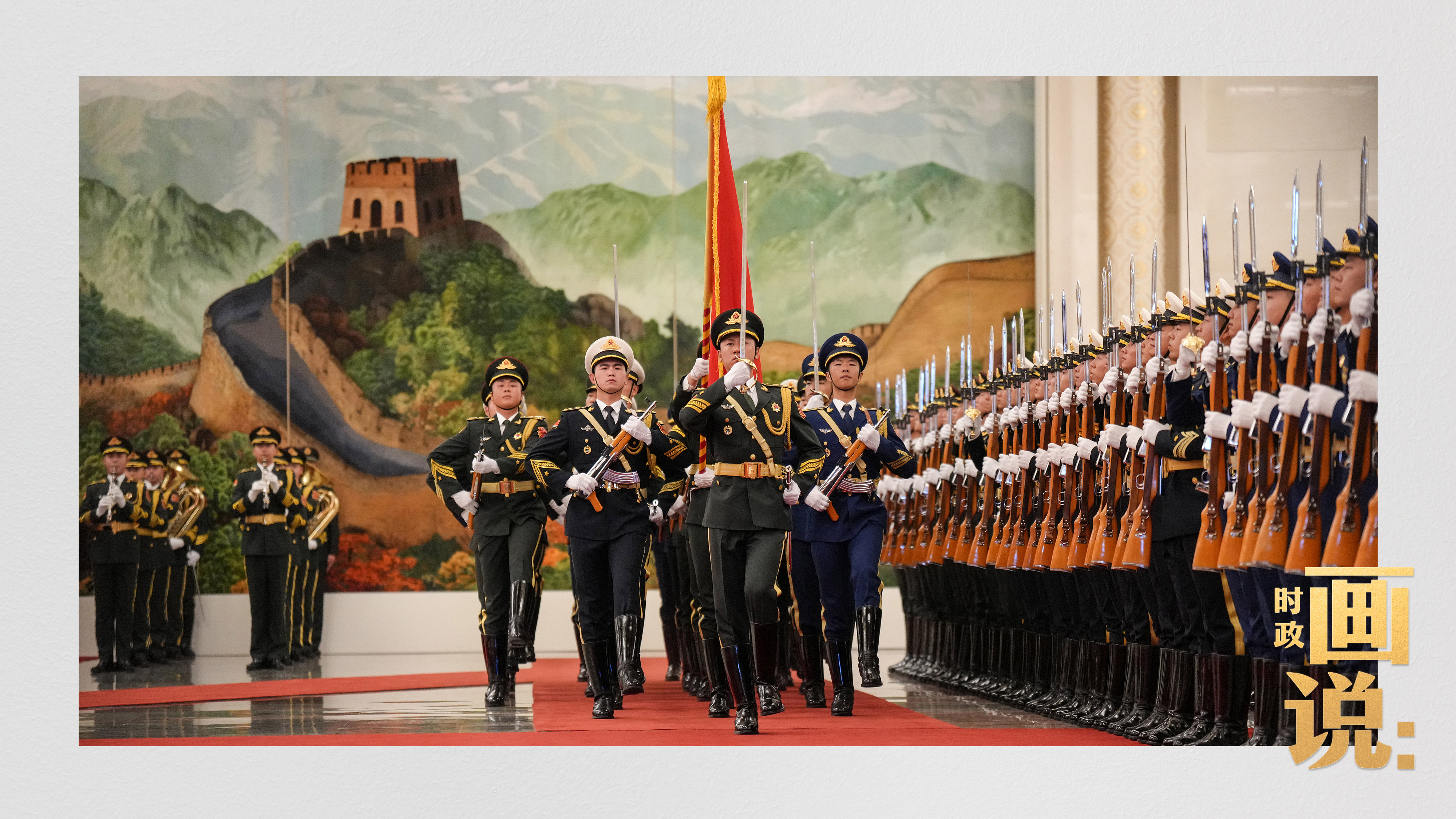 △馬克龍在習(xí)近平陪同下檢閱中國人民解放軍儀仗隊并觀看分列式