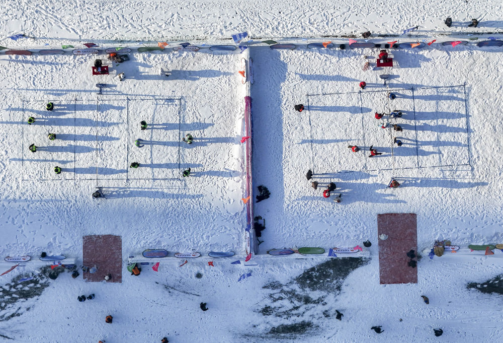 2025年12月25日,人們在第八屆哈爾濱松花江冰雪嘉年華園區(qū)內(nèi)體驗(yàn)冰上排球(無人機(jī)照片)。本屆冰雪嘉年華推出近60項(xiàng)特色項(xiàng)目,為市民與游客打造多樣化的冰雪體驗(yàn)。