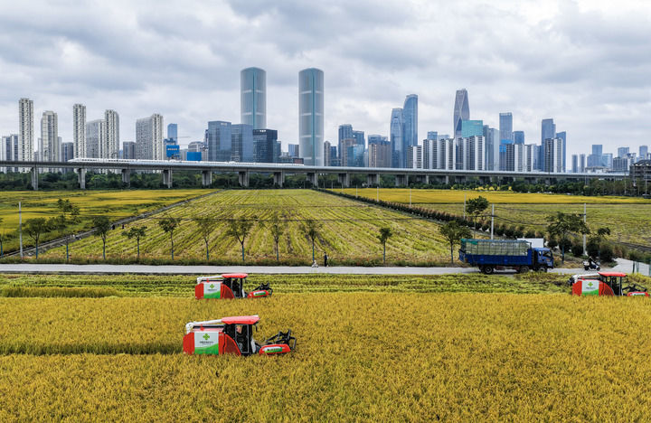 收割機(jī)在位于浙江杭州蕭山區(qū)世紀(jì)田園糧食功能區(qū)的稻田里收割水稻,遠(yuǎn)處高鐵列車(chē)飛馳而過(guò)(2025年10月21日攝,無(wú)人機(jī)照片)。新華社記者 徐昱 攝