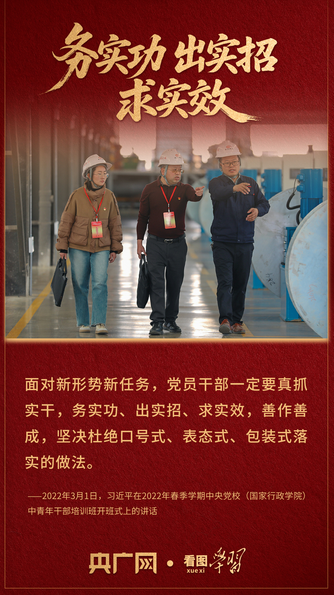 “一件一件抓落實(shí),一年接著一年干,努力讓群眾看到變化、得到實(shí)惠”。習(xí)近平總書記深刻指出,面對(duì)新形勢(shì)新任務(wù),黨員干部一定要真抓實(shí)干,務(wù)實(shí)功、出實(shí)招、求實(shí)效,善作善成,堅(jiān)決杜絕口號(hào)式、表態(tài)式、包裝式落實(shí)的做法。