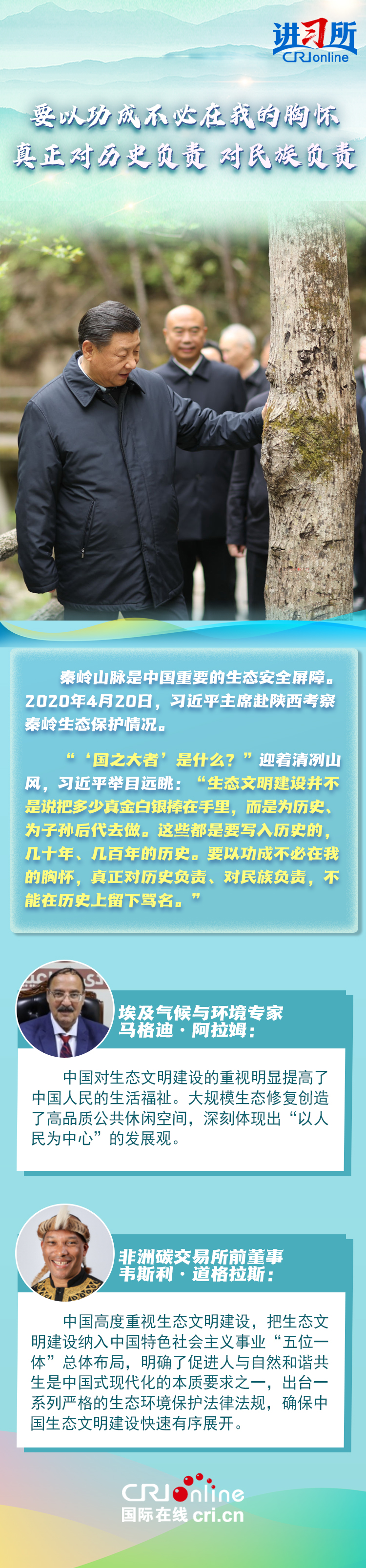 中共十八大以來,中國(guó)森林面積和蓄積量持續(xù)“雙增長(zhǎng)”,荒漠化和沙化土地面積持續(xù)“雙縮減”,是全球增綠最多最快的國(guó)家。習(xí)近平主席始終身體力行:在北京連續(xù)14年參加首都義務(wù)植樹活動(dòng),在甘肅與林場(chǎng)職工一起進(jìn)行“草方格壓沙”作業(yè),在陜西親自“驗(yàn)收”秦嶺生態(tài)保護(hù)……