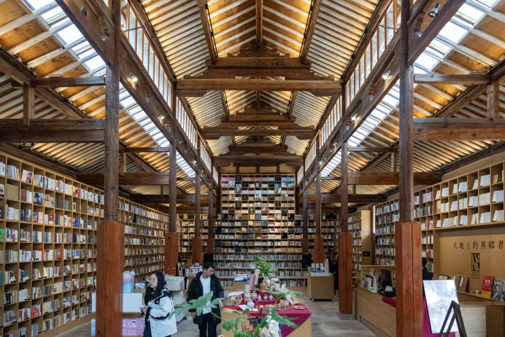 這是2025年3月17日拍攝的大理州沙溪鎮(zhèn)先鋒沙溪白族書(shū)局。這家書(shū)店坐落在劍川縣距沙溪古鎮(zhèn)約兩公里的地方。書(shū)局依托村子的舊糧倉(cāng)改造而成,如今已經(jīng)成為一座文化地標(biāo)和“精神糧倉(cāng)”。