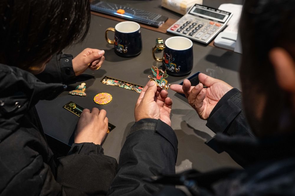2026年1月15日,云南麗江白沙壁畫(huà)博物館館長(zhǎng)楊志堅(jiān)(右)與同事討論文創(chuàng)產(chǎn)品設(shè)計(jì)。近年來(lái),白沙壁畫(huà)博物館持續(xù)推動(dòng)白沙壁畫(huà)赴廣東、上海等地展覽,主持編纂畫(huà)冊(cè),并推進(jìn)數(shù)字化采集和文創(chuàng)開(kāi)發(fā),讓壁畫(huà)藝術(shù)以新的形式走進(jìn)人們的日常生活。