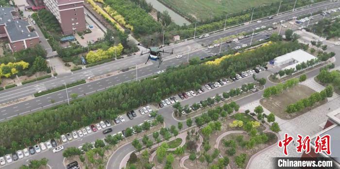 搭載模擬急救血液的無人機(jī)在飛行途中。(天津醫(yī)科大學(xué)腫瘤醫(yī)院 供圖)