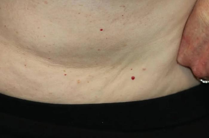 還有一個(gè)值得說(shuō)的一個(gè)現(xiàn)象,是皮膚長(zhǎng)紅痣,也就是散在的小紅點(diǎn),就像下圖這樣。