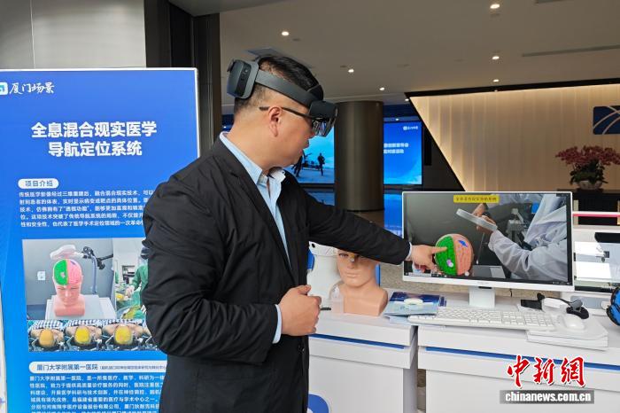 3月26日,廈門場景創(chuàng)新發(fā)布會暨供需對接活動舉辦。圖為廈門大學(xué)附屬第一醫(yī)院卒中中心主任陳四方向參會者介紹該醫(yī)院的“全息混合現(xiàn)實(shí)醫(yī)學(xué)導(dǎo)航定位系統(tǒng)”。 吳冠標(biāo) 攝
