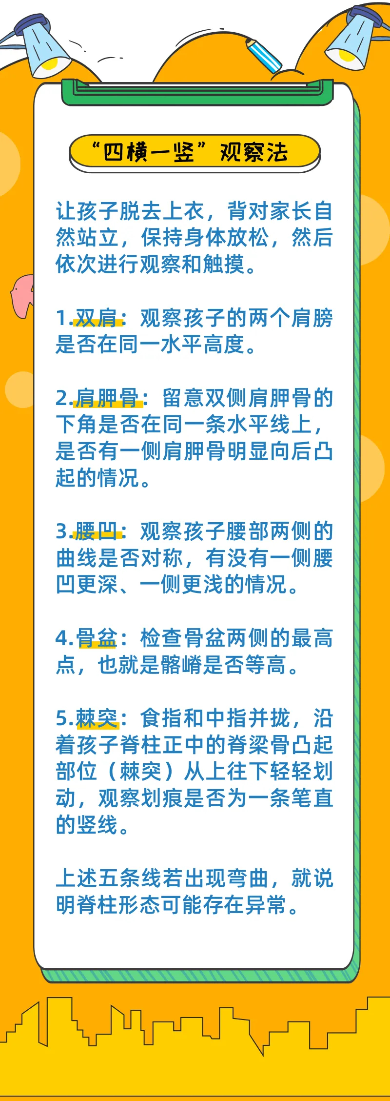 守護(hù)孩子的脊柱健康,家庭是第一道“崗哨”。家長掌握簡單、有效的自查方法,能第一時間發(fā)現(xiàn)孩子脊柱的異常信號。這里教大家一個簡單易操作的“四橫一豎”觀察法,在家就能給孩子做篩查。