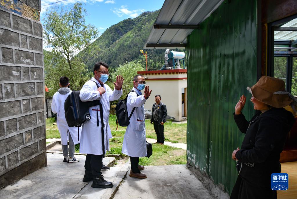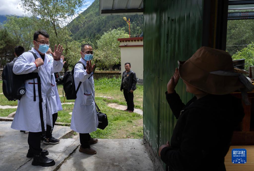 6月12日,王振疆醫(yī)生一行離開(kāi)時(shí),病人阿珍的女兒(右)和他們揮手告別。新華社記者 晉美多吉 攝