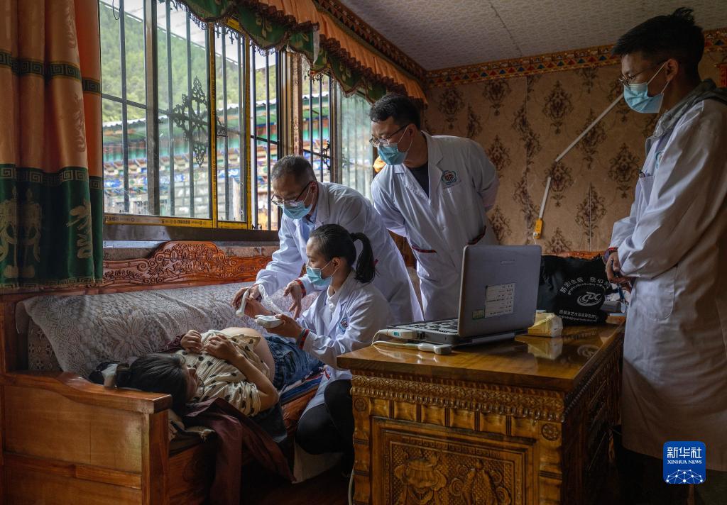 6月12日,王振疆(上左)、王彤旭(上中)和尼瑪益西(右一)協(xié)助陳冰(下右)為扎西央宗進(jìn)行產(chǎn)檢。新華社記者 費(fèi)茂華 攝