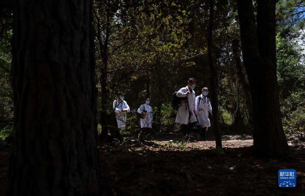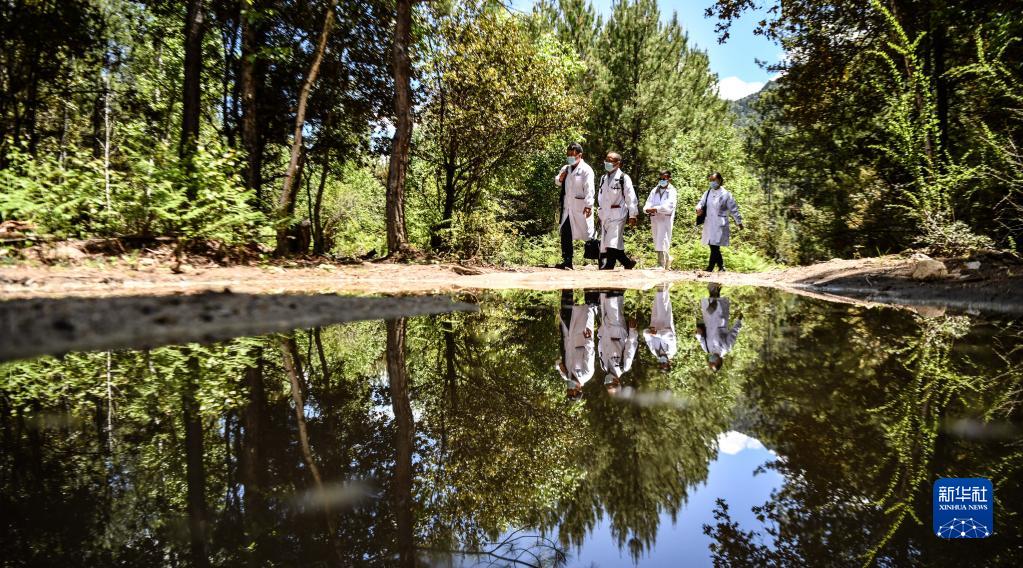 6月12日,王振疆(右一)、王彤旭(右二)、陳冰(右三)和尼瑪益西在樹(shù)林間行走。新華社記者 費(fèi)茂華 攝