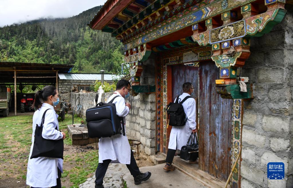 6月12日,王振疆(右)、王彤旭(中)、陳冰(左)來(lái)到吞不絨村一戶患者家中送醫(yī)上門(mén)。新華社記者 晉美多吉 攝