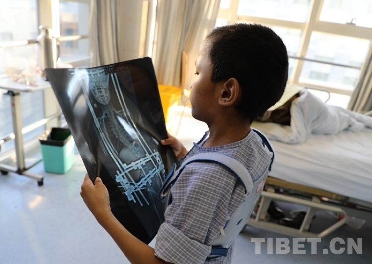 病房內(nèi),9歲的扎西曲培已經(jīng)完成了手術(shù),在病房里奔走玩耍。他煞有介事地拿起自己的x光片,說“這是我的,快治好的?!崩畲镜抡f,“這個小男孩調(diào)皮得很,天天很活躍,眼睛里都是機(jī)靈。剛來的時候他肩膀一個高一個低,肩胛骨也不對稱,如今走路的時候形態(tài)完全正常,身高長了12公分,因?yàn)槟挲g小,將來恢復(fù)估計會更好一些?!?/p>