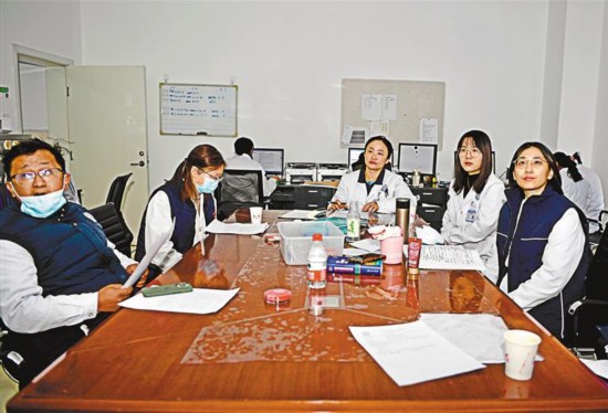 中國醫(yī)學(xué)科學(xué)院腫瘤醫(yī)院援自治區(qū)人民醫(yī)院醫(yī)生李逸群(右一)與本地醫(yī)生一起交流病例。記者 王敏 攝