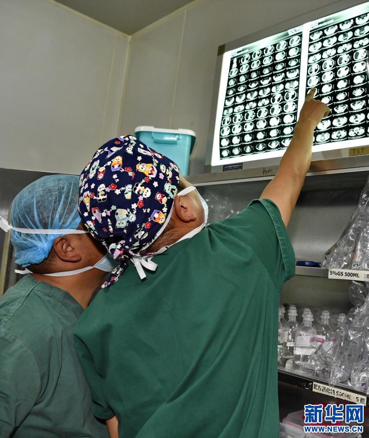 在拉薩市人民醫(yī)院第二手術(shù)室,兩位醫(yī)生在術(shù)前仔細(xì)觀察包蟲(chóng)病患者的CT檢查圖像(2020年12月31日攝)。新華社記者 張汝鋒 攝