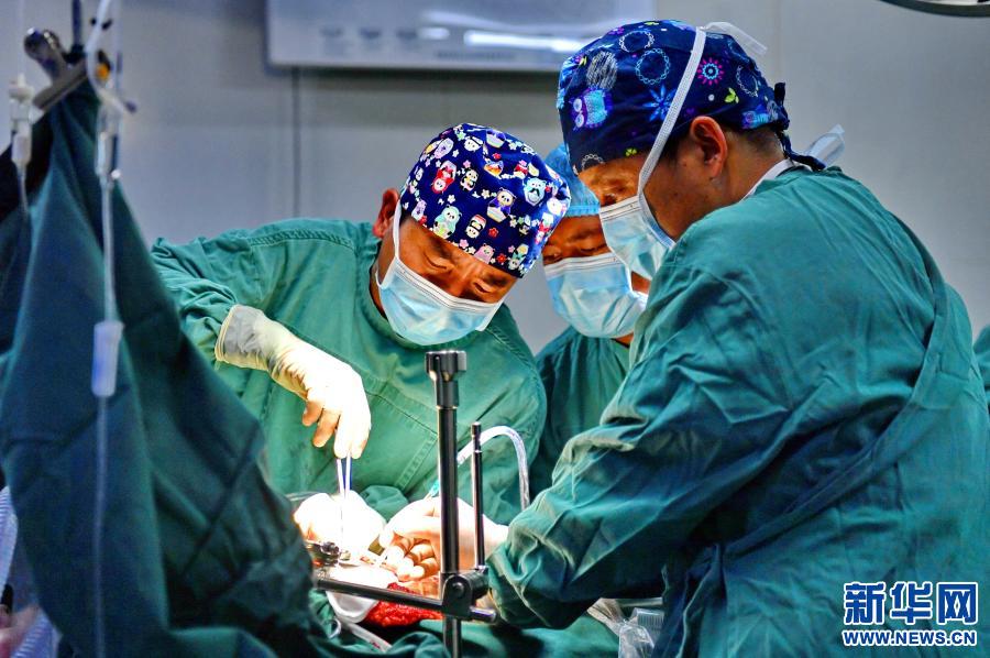 在拉薩市人民醫(yī)院第二手術(shù)室,主治醫(yī)師醫(yī)生扎西云旦(右)在和同事為包蟲(chóng)病患者做手術(shù)(2020年12月31日攝)。新華社記者 張汝鋒 攝