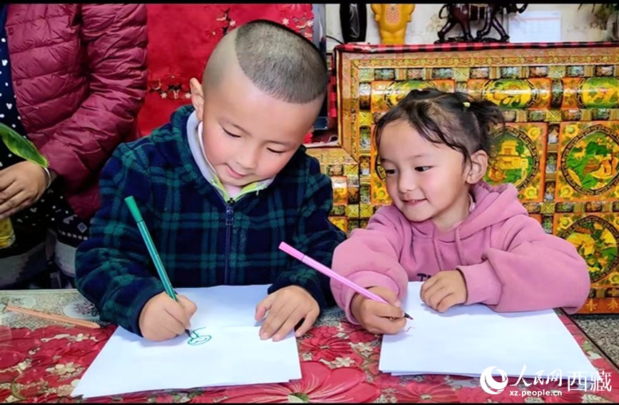 向巴貢丹(左)和妹妹一起在家畫(huà)畫(huà)。 人民網(wǎng) 李海霞攝