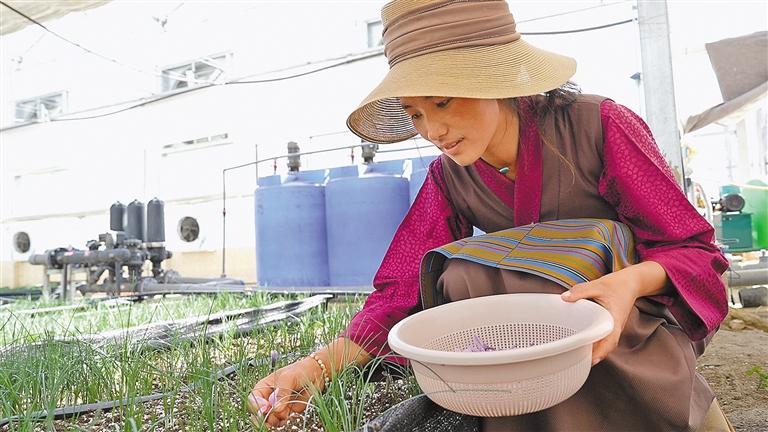 工作人員在采摘藏紅花。記者 索朗旺久 通訊員 次旺倫珠 攝