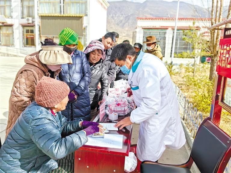 近日,拉薩市堆龍德慶區(qū)婦聯(lián)在包村點(diǎn)古榮鎮(zhèn)加入村開展送醫(yī)送藥送健康活動(dòng),邀請(qǐng)西藏雄巴拉曲神水藏藥有限公司醫(yī)務(wù)人員為群眾進(jìn)行義診。 圖為義診現(xiàn)場(chǎng)。記者 拉巴桑姆 攝