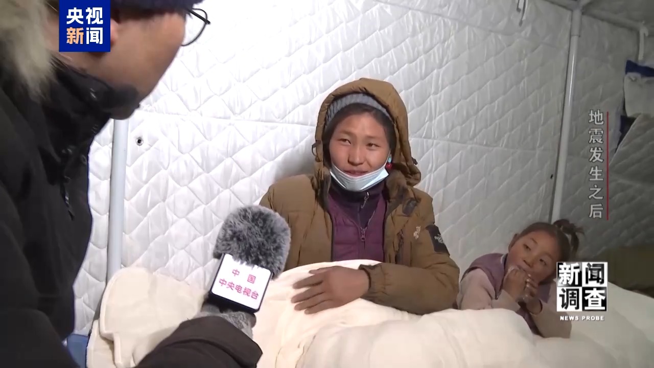 總臺記者 呂小品:像這樣一個臨時受災群眾的安置點,大概現(xiàn)在已經(jīng)有80余個。而且已經(jīng)能夠容納近萬名受災群眾,我所在的森嘎村安置點是所有安置點當中最大的一個?,F(xiàn)場目前已經(jīng)搭建起了30余個救災的帳篷,每一個帳篷當中保暖御寒的措施,剛剛我也進去看了一下,做得還是不錯的。這樣的一個帳篷其實分了好幾層,有這樣的保溫層在這里??梢钥吹皆谶@樣的帳篷當中,其實像一個房間這么大。我們所有的受災群眾現(xiàn)在已經(jīng)領(lǐng)取到了一些御寒的棉被、褥子,搭起了簡易床,地上還有防寒隔潮的墊子,被子是比較厚實的。