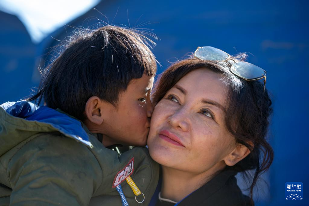 1月11日,在定日縣曲洛鄉(xiāng)措昂村的受災(zāi)群眾安置點(diǎn),一名女孩親吻譚惜仁(右)。新華社記者 沈伯韓 攝