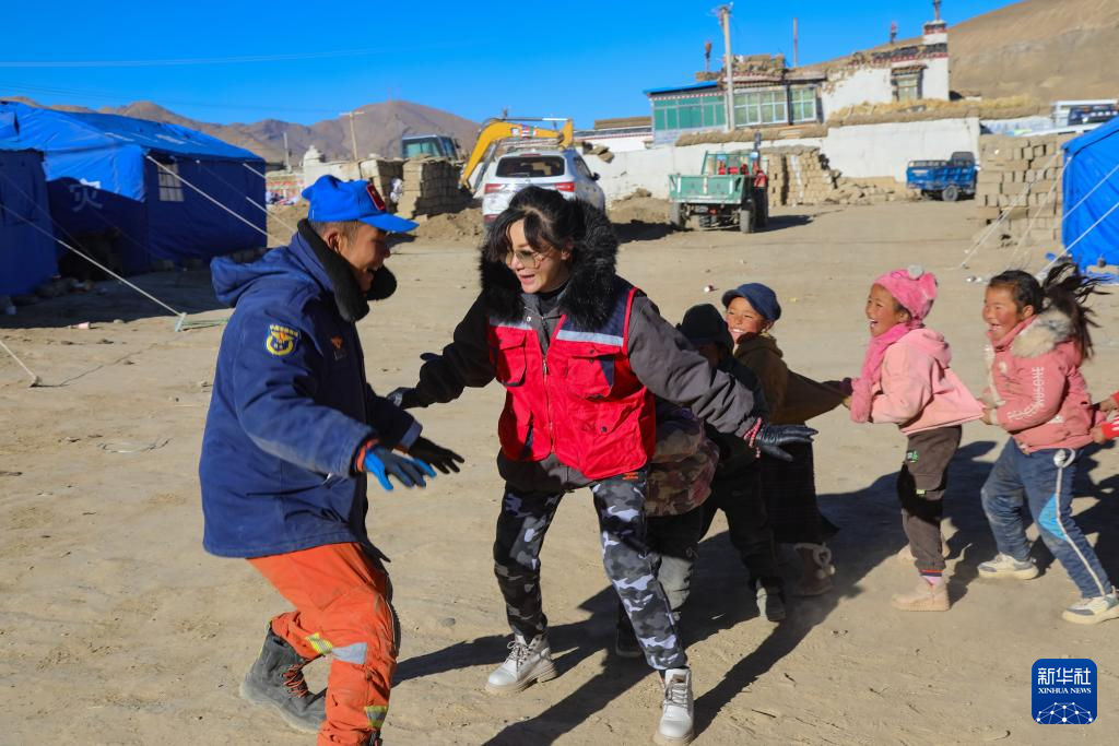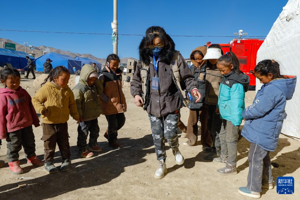 1月10日,在定日縣曲洛鄉(xiāng)措昂村的受災(zāi)群眾安置點(diǎn),譚惜仁(左二)與西藏森林消防總隊(duì)的救援人員(左一)一起帶著孩子們與玩游戲。新華社發(fā)(鄭龍 攝) ??