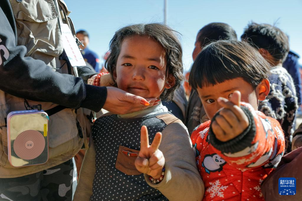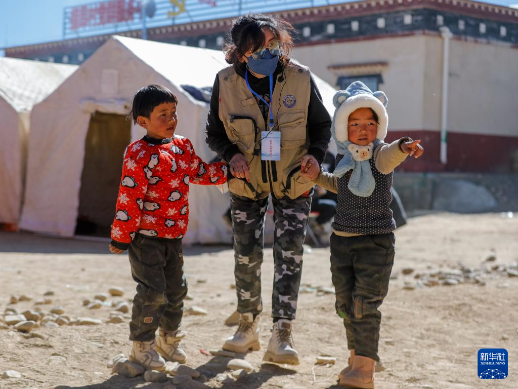 1月11日,在定日縣曲洛鄉(xiāng)措昂村的受災(zāi)群眾安置點(diǎn),譚惜仁(中)與孩子們在一起。新華社記者 沈伯韓 攝 ??
