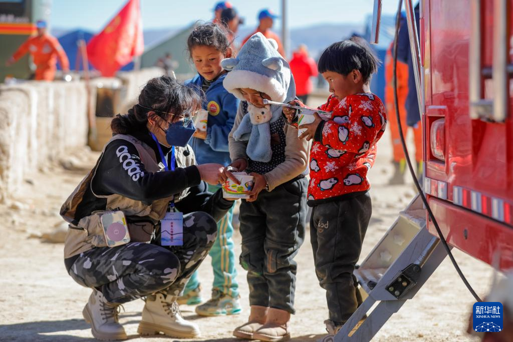 1月11日,在定日縣曲洛鄉(xiāng)措昂村的受災(zāi)群眾安置點(diǎn),譚惜仁(左一)陪著孩子們吃午餐。新華社記者 沈伯韓 攝 ??