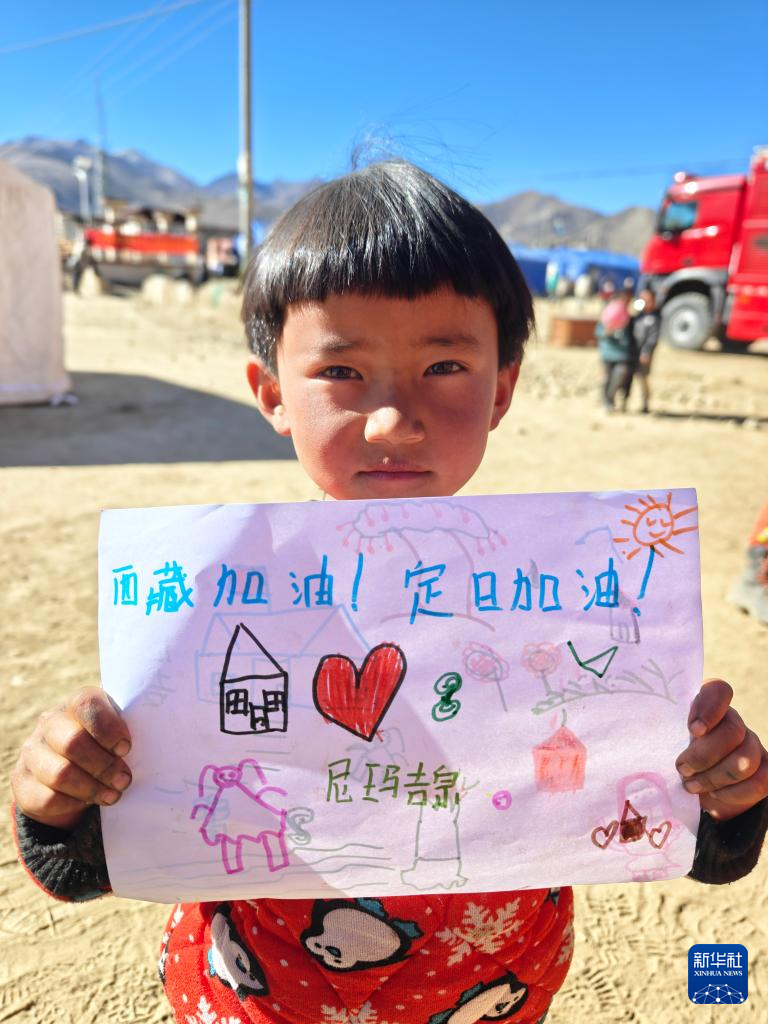 1月11日,在定日縣曲洛鄉(xiāng)措昂村的受災(zāi)群眾安置點(diǎn),藏族女孩尼瑪吉宗展示她的畫作。新華社記者 謝佼 攝