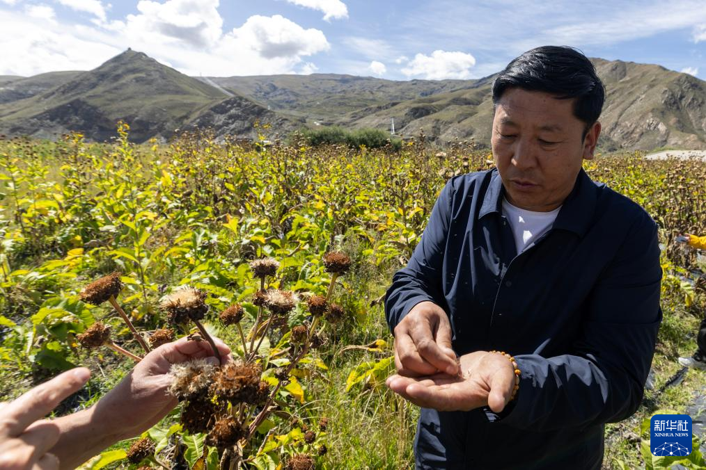 在西藏山南德諾農(nóng)林產(chǎn)業(yè)開發(fā)有限責(zé)任公司的種植基地,公司總經(jīng)理普巴在查看藏藥材草紅花的長(zhǎng)勢(shì)(9月18日攝)。新華社記者 姜帆 攝