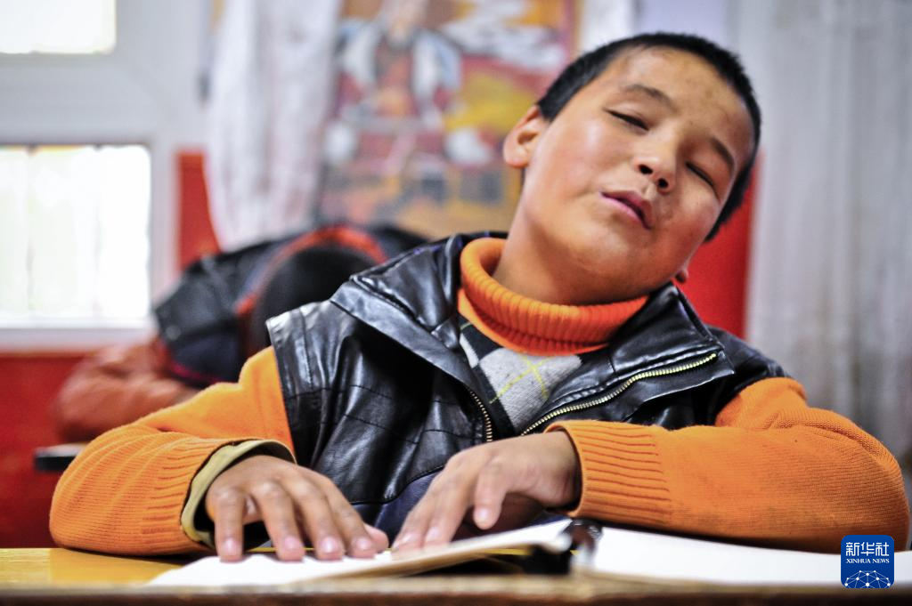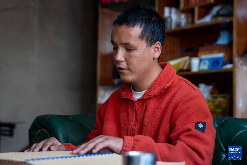 2025年10月10日,達瓦次仁在“閱讀”盲文書籍。