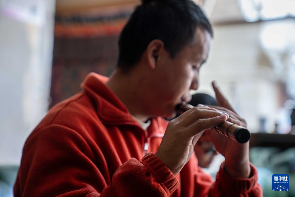 2025年10月10日,達瓦次仁在練習(xí)吹奏笛子。