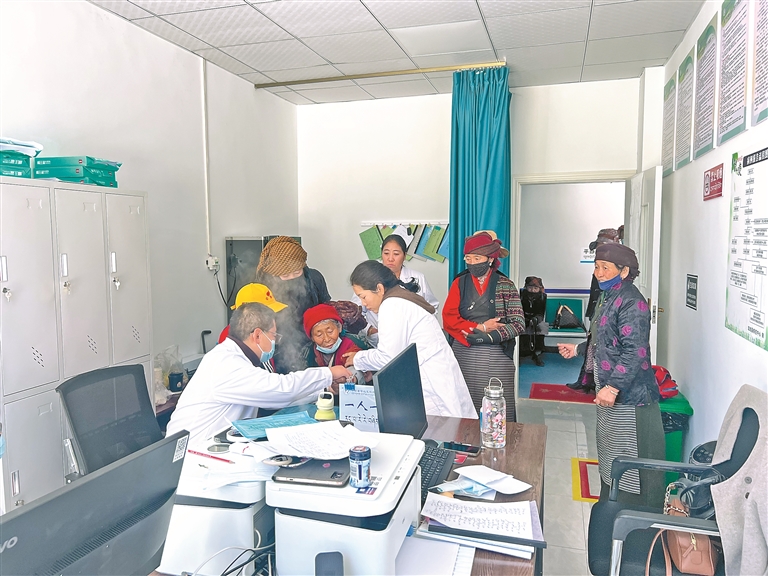 圖為瓊結(jié)縣拉玉鄉(xiāng)衛(wèi)生院醫(yī)護人員在為群眾看病。