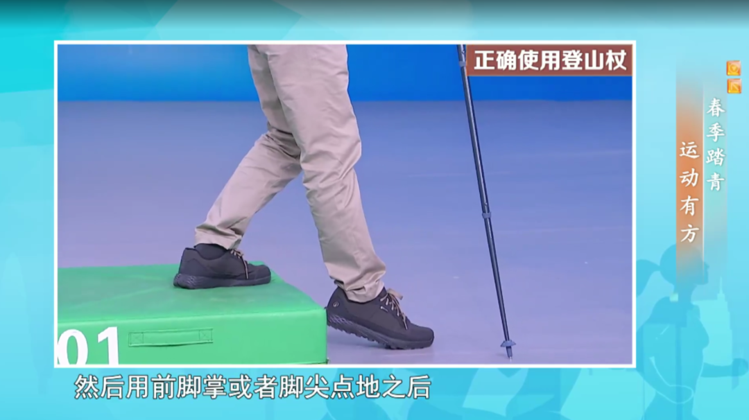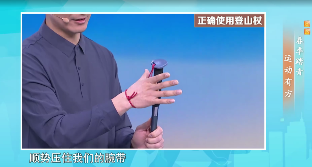 手從登山杖下方的孔穿入,虎口壓住腕帶再握緊;上山時調(diào)短一點,貼近身體借力;下山時調(diào)長一點,手臂與地面平行,先將登山杖往前放,增加支撐面積,穩(wěn)定重心。