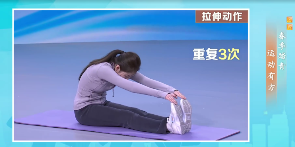 坐姿,雙腿伸直,緩慢彎腰觸碰腳尖,保持10秒,重復3次。