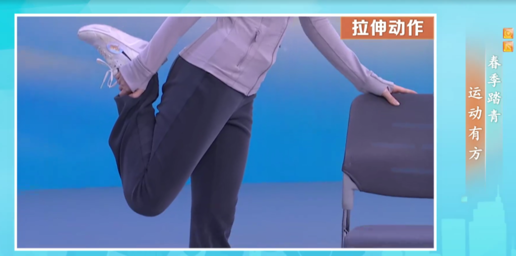 站立,單手扶墻,另一手抓住對側(cè)腳踝并向臀部拉伸,保持10秒,重復3次。