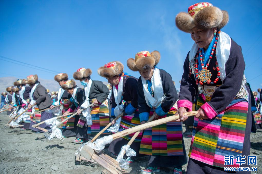 當(dāng)日是西藏農(nóng)民舉行一年一度春耕大典的日子。村民沿襲著傳承千年的春耕民俗,身著節(jié)日盛裝,手捧“切瑪”(五谷豐登斗),唱起祈愿歌,互敬青稞酒。當(dāng)鐵犁翻開土地,婦女將手中的種子撒下,祈求新的一年豐收。