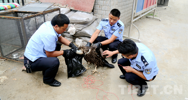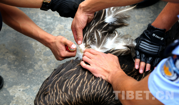 過了一會兒,正在路邊施工的工人發(fā)現(xiàn)了我,他們立即打電話。后來我才知道,他打到了丹巴縣環(huán)林局野保科(這可是專門負(fù)責(zé)保護(hù)動(dòng)物的機(jī)構(gòu)喔)。隨后,就見有穿制服的工作人員來了,救星??!他們給我檢查了身體,發(fā)現(xiàn)了我右爪脫臼傷情,就把我?guī)Щ氐搅说ぐ蜕止簿帧?/p>