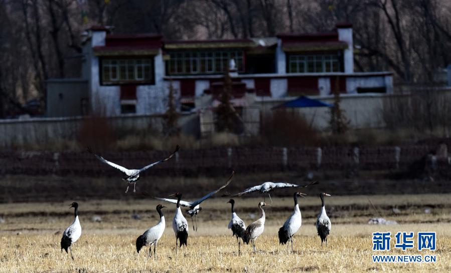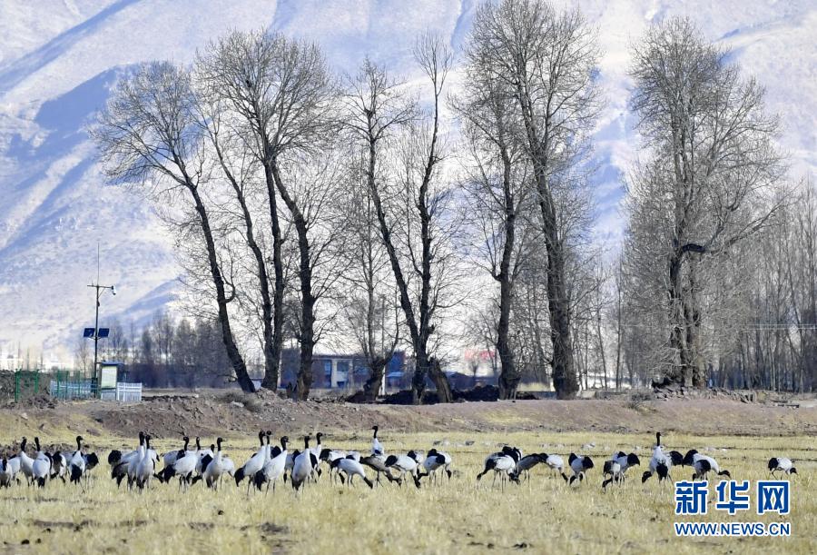 林周縣黑頸鶴自然保護區(qū)里的黑頸鶴(12月12日攝)。新華社記者 張汝鋒 攝