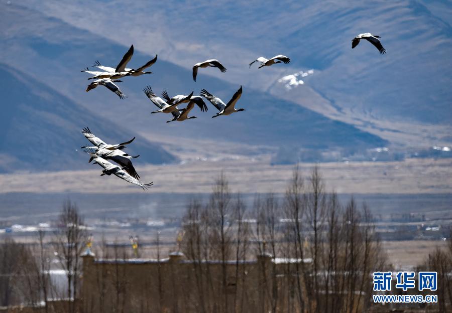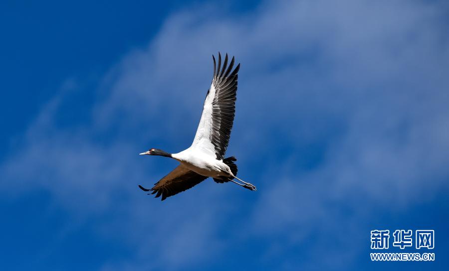 黑頸鶴在林周縣黑頸鶴自然保護區(qū)上空飛翔(12月12日攝)。新華社記者 黃豁 攝