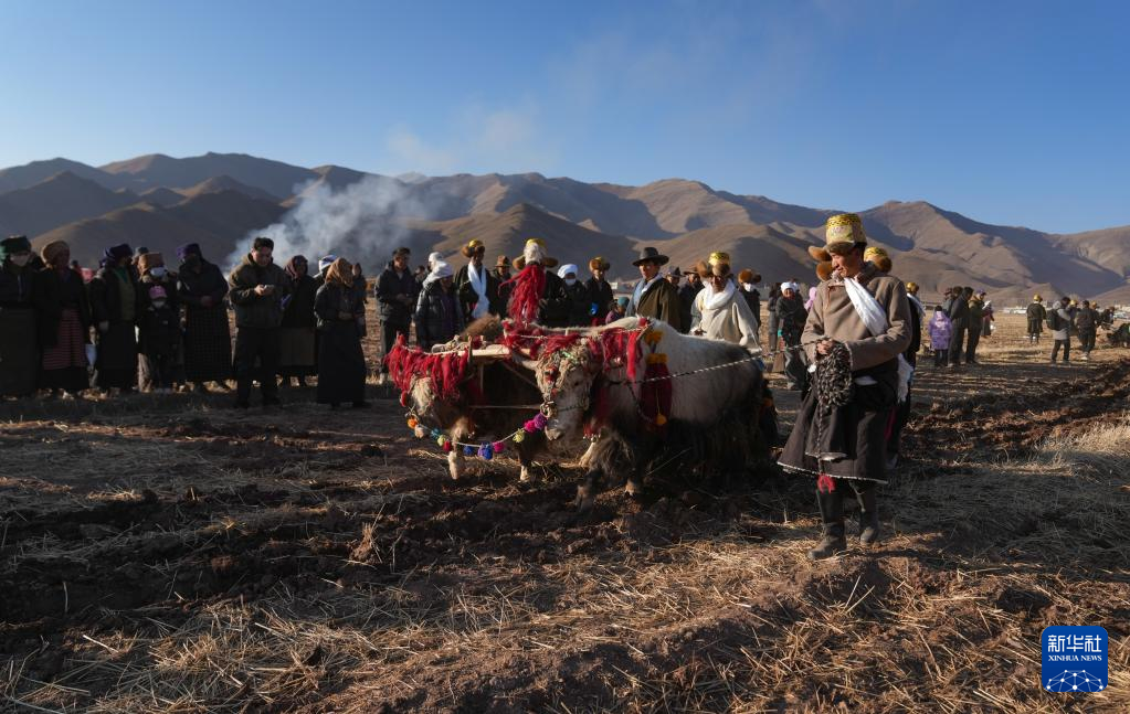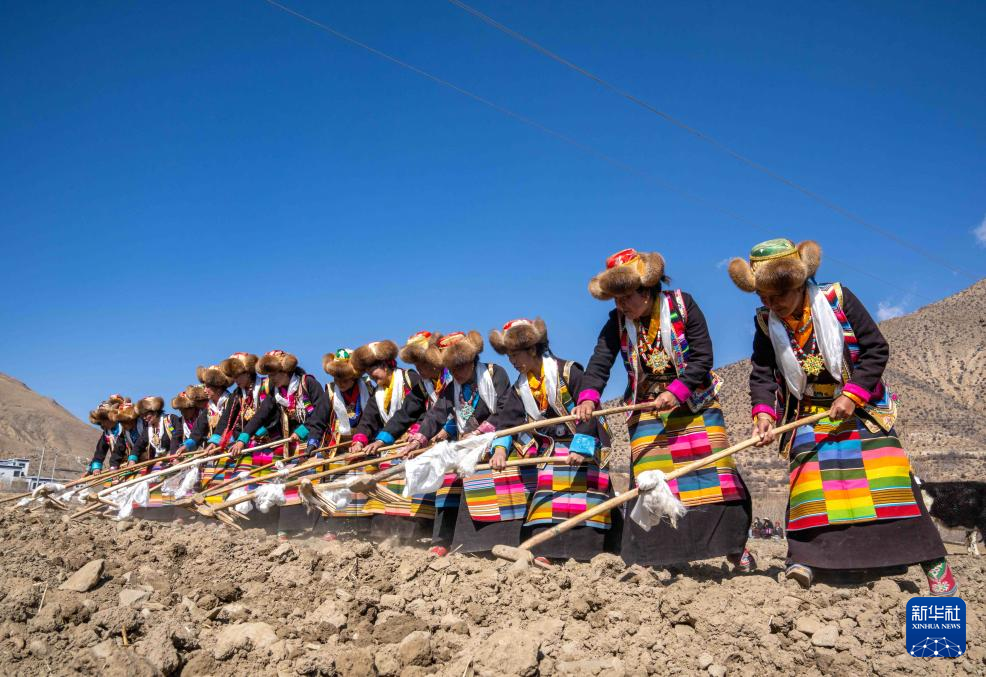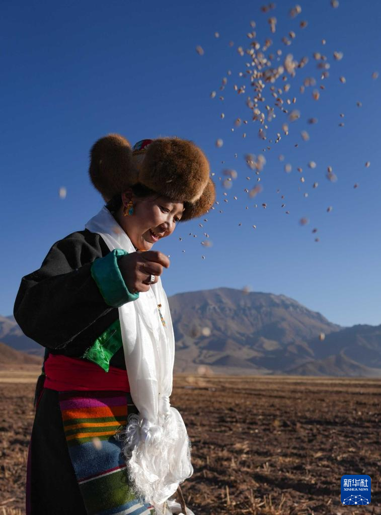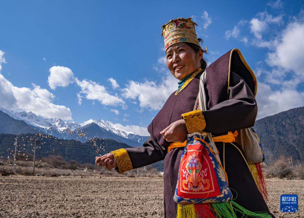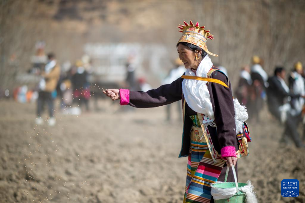 當(dāng)日是西藏農(nóng)民舉行一年一度春耕大典的日子。村民沿襲著傳承千年的春耕民俗,身著節(jié)日盛裝,手捧“切瑪”(五谷豐登斗),唱起祈愿歌,互敬青稞酒。當(dāng)鐵犁翻開(kāi)土地,婦女將手中的種子撒下,祈求新的一年豐收。