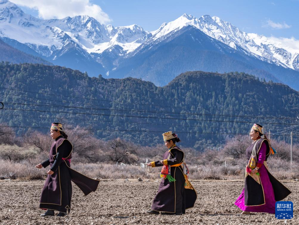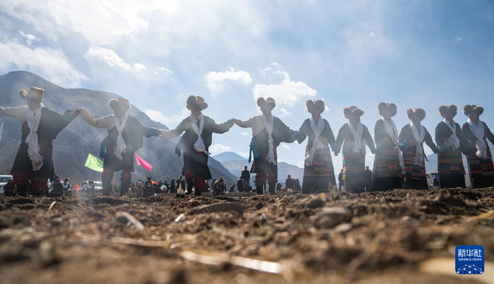 3月16日,在西藏拉薩市林周縣春堆鄉(xiāng)的春耕儀式現(xiàn)場(chǎng),當(dāng)?shù)厝罕姳硌莶貞?。新華社記者 張汝鋒 攝