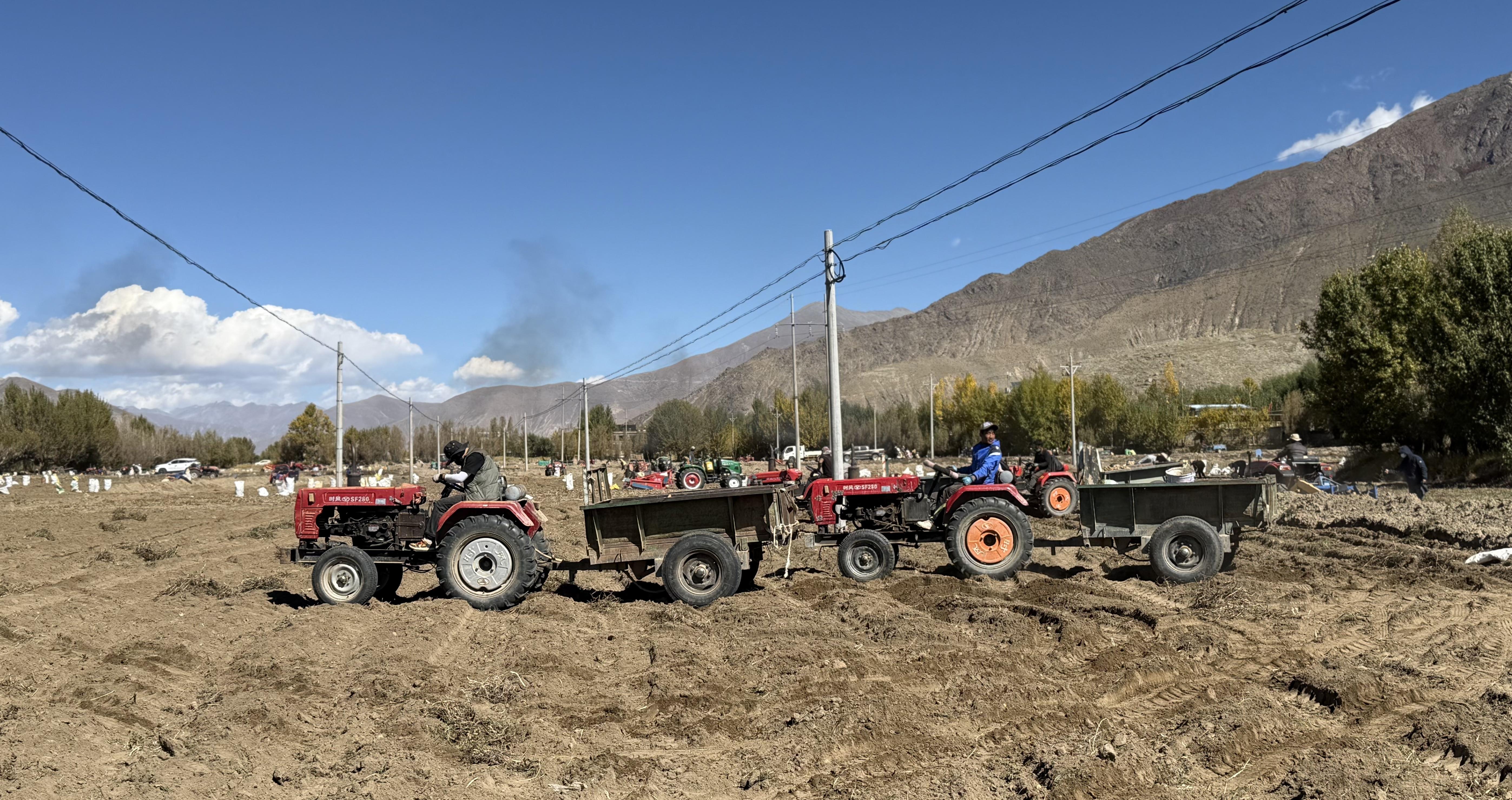圖為南木林縣艾瑪鄉(xiāng)山巴村村民正在使用機(jī)械收獲土豆