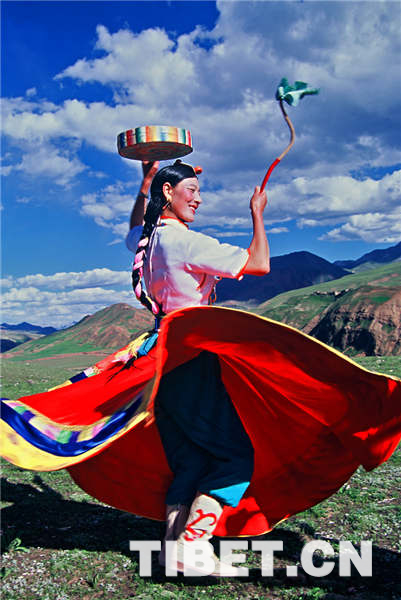 藏舞千姿百態(tài),種類繁多,有不同分類方式。一種說法將藏族舞蹈分為 “民間歌舞”(果諧、堆諧、果卓等),“宗教舞蹈”(“羌姆”、祭祀舞等),戲曲舞(格薩爾等)和宮廷舞(“嘎爾”舞、古格宣舞等)四類。圖為牧民的女兒熱情舞蹈。圖片來源:中國(guó)西藏網(wǎng),孫明光攝。
