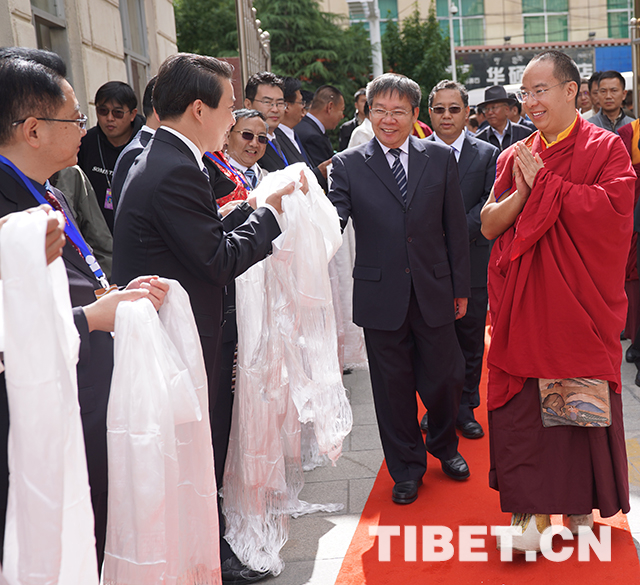 十一世班禪與前來迎接的山南市有關(guān)領(lǐng)導(dǎo)握手致意。攝影:王淑