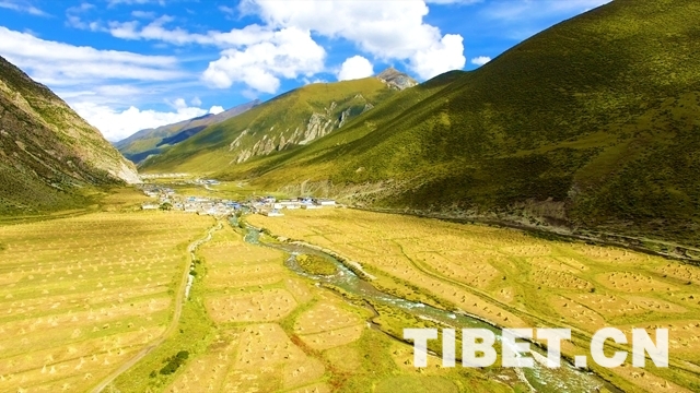中國(guó)西藏網(wǎng)訊 從拉薩市出發(fā),沿著蜿蜒的拉薩河一路向東約100公里抵達(dá)墨竹工卡縣扎西崗鄉(xiāng),在鄉(xiāng)政府旁邊的小橋分岔處沿河道上行,一路溪水潺潺,河床兩旁田地內(nèi)打捆的青草盡情享受著陽(yáng)光的沐浴,藍(lán)天下牦牛搖著尾巴愜意地覓食,裊裊炊煙在新建的住房上空飄蕩……
